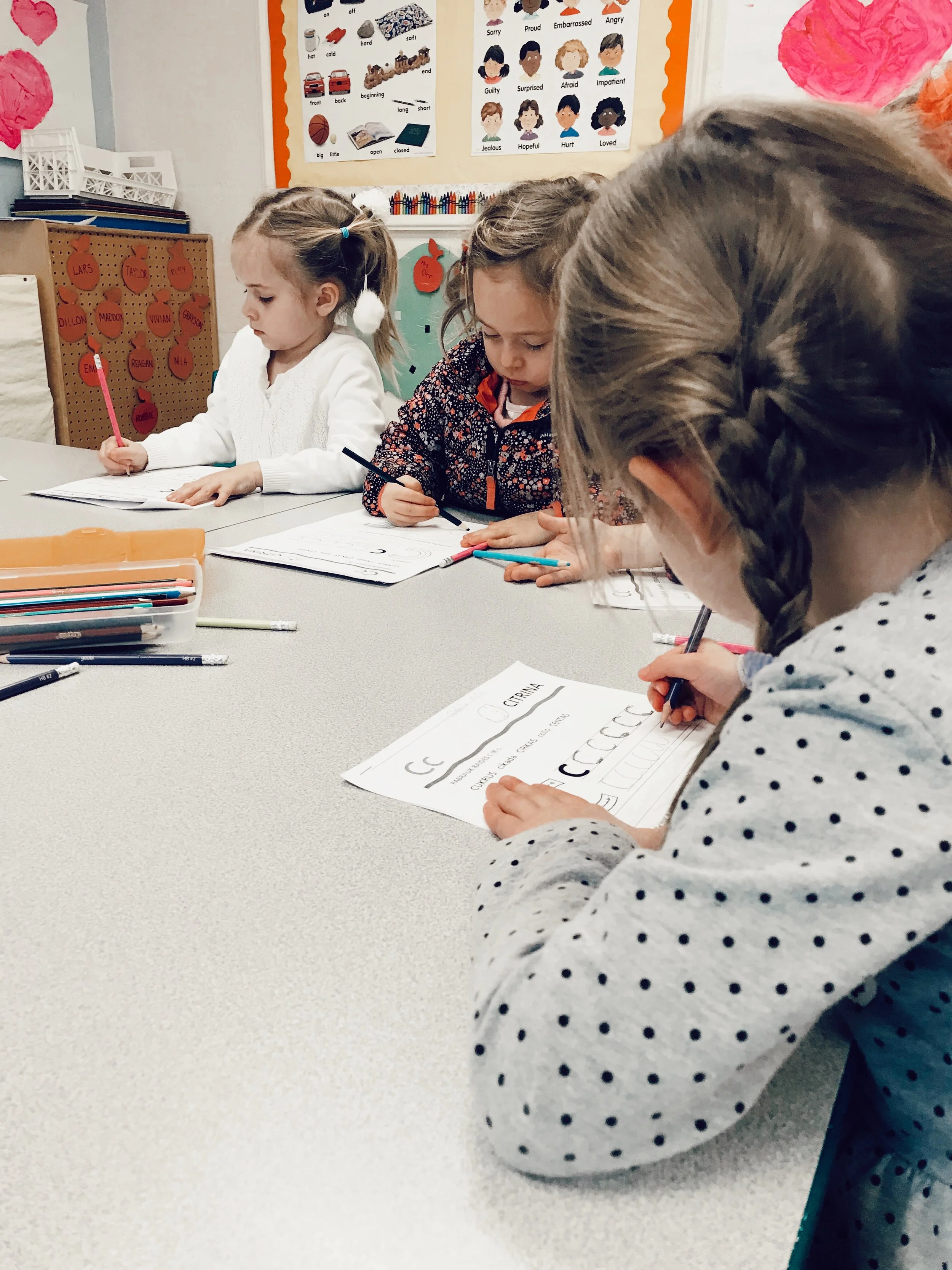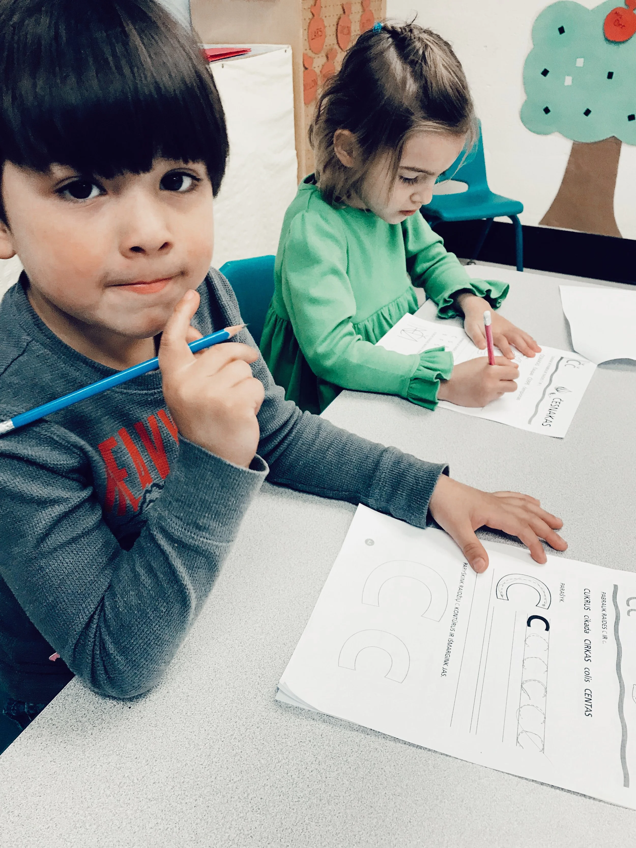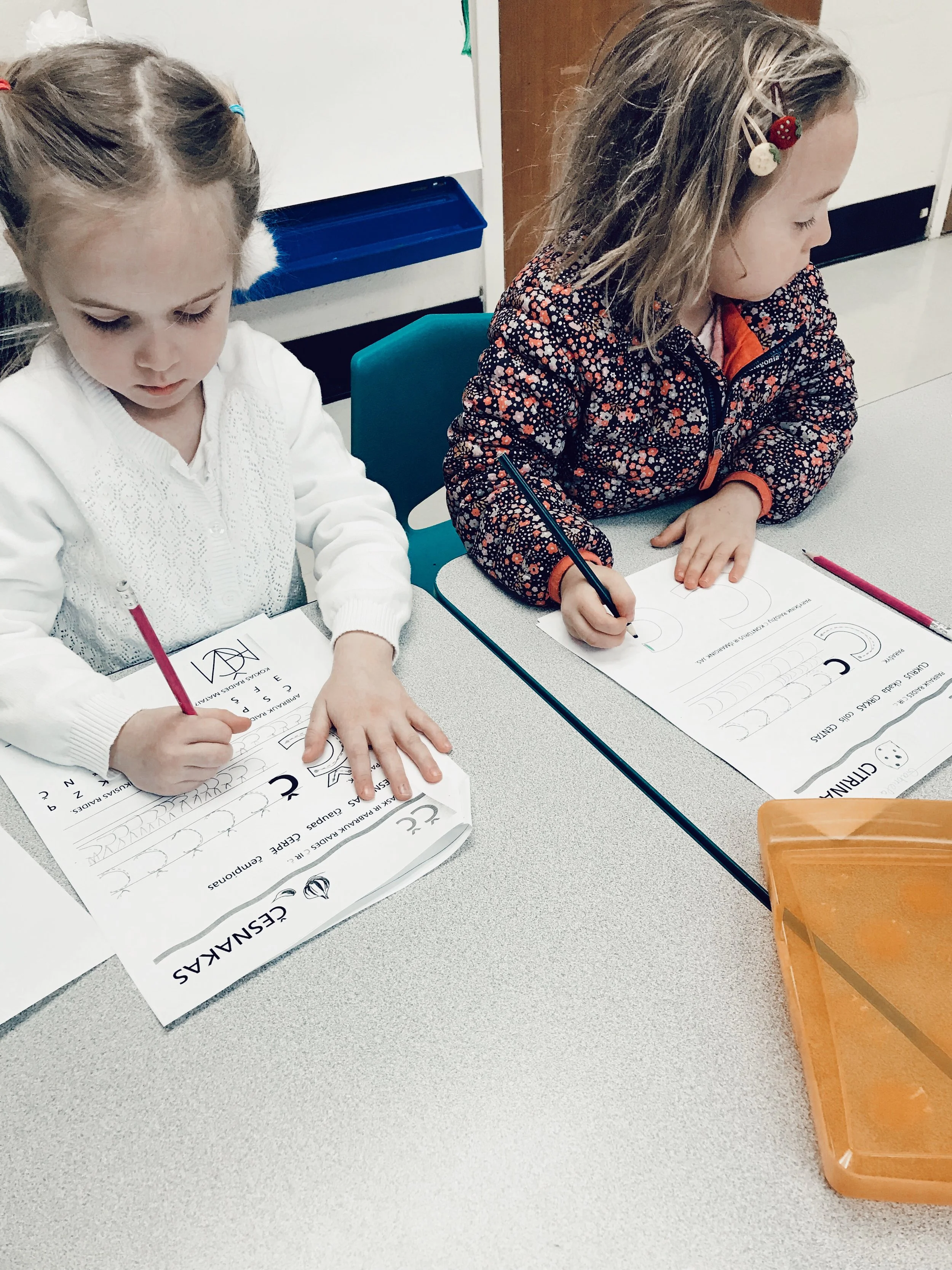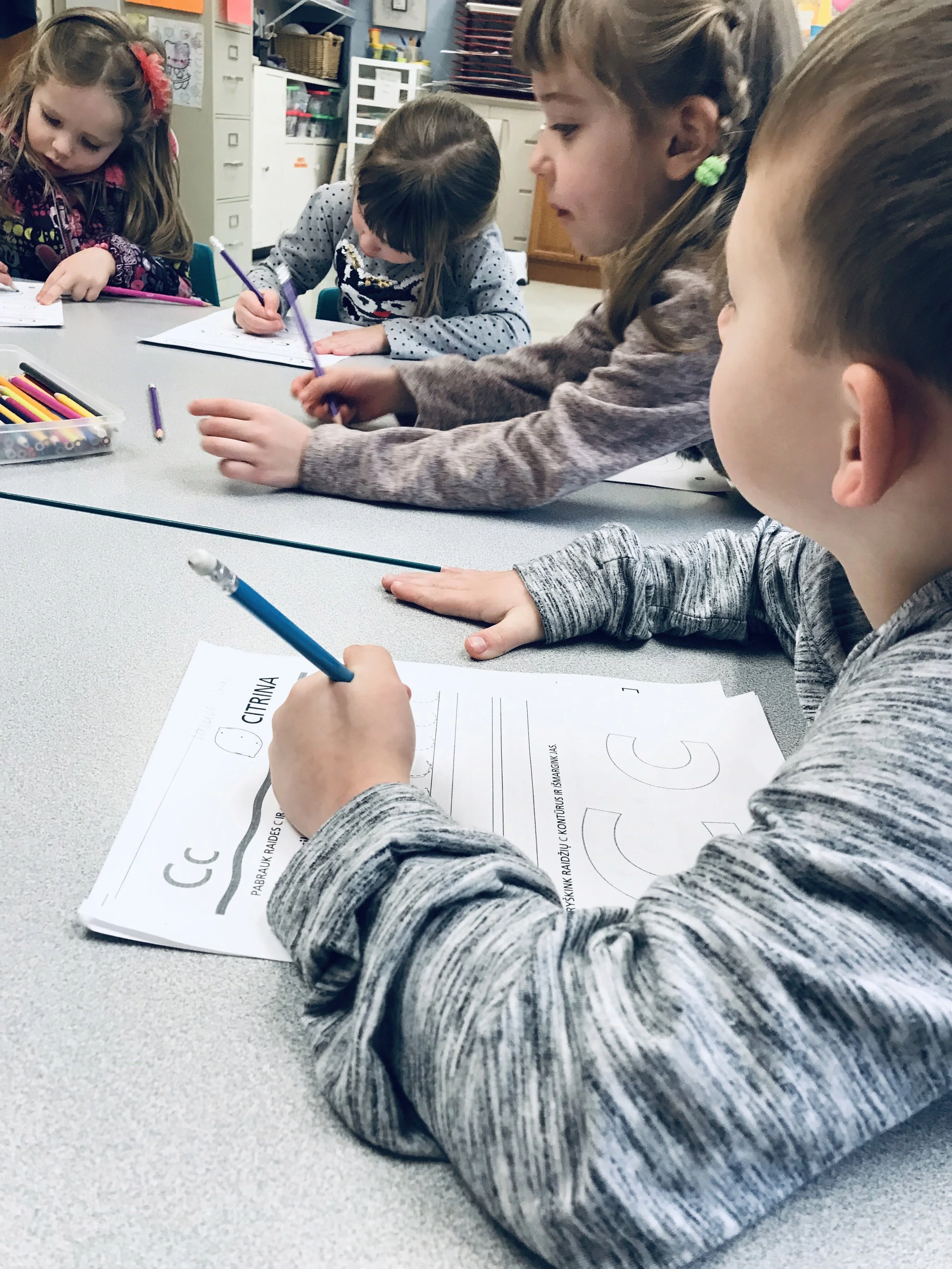 Peledziukai class listened to poems, admired the sound of Lithuanian language, learned letters, and decorated the first letter of their name.